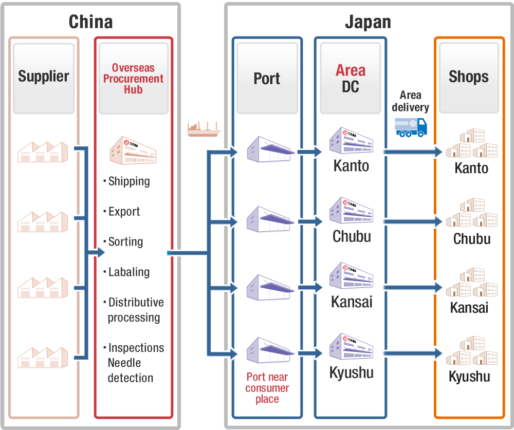 In order to "optimize the supply chain from factories in Asia to shop shelves in Japan," we set up "Overseas Procurement Hub" warehouses and conducted distributive processing such as branch-based sorting, inspections and needle detection in Asia, completing many of the tasks in China that would normally be performed in Japan, thus reducing various costs.