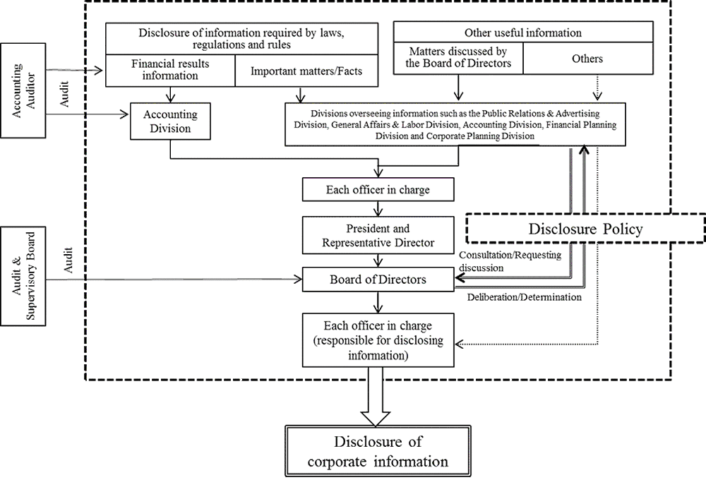 Our company, in an effort to encourage dialogues with shareholders and investors, has established the Investor Relations Promotion Group in the Corporate Planning Division, while the Director in charge of the Corporate Planning Division oversees IR activities. The Investor Relations Promotion Group serves as the secretariat for information disclosures and the Disclosure Policy is determined by the Board of Directors based on the consultation with the Public Relations & Advertising Division, the General Affairs & Labor Division, the Accounting Division, the Financial Planning Division and the Corporate Planning Division on the appropriateness of information disclosure policies and information disclosure activities. Based on this Disclosure Policy, we disclose information, under the responsibility of the Representative Director or the officers in charge of each information to be disclosed.